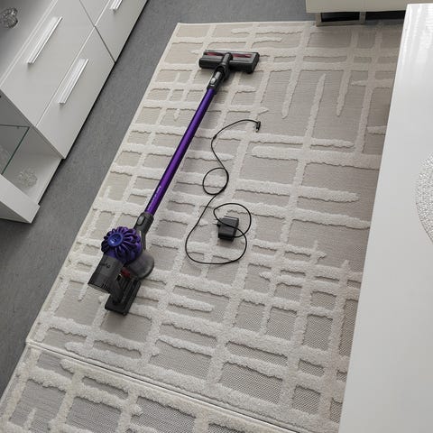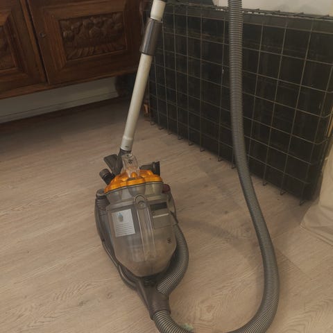 Dyson pölynimuri. Johtava malli, jossa on letku ja teleskooppiputki lattioiden ja muiden pintojen imurointiin. Soveltuu kodin yleiseen siivoukseen kovilta lattioilta ja matoilta. Mukana peruslattiasuulake, näkyvissä säiliö ja suodatinosa. Sähkökäyttöinen laite, jossa pölysäiliö tyhjennettävissä ilman pölypussia.