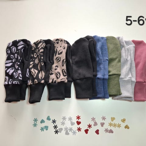Saatavilla myös koossa 3-4v, 5-6v ja vauvojen peukalottomia. Tilauksesta muita kokoja, myös aikuisen kokoisia.