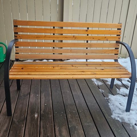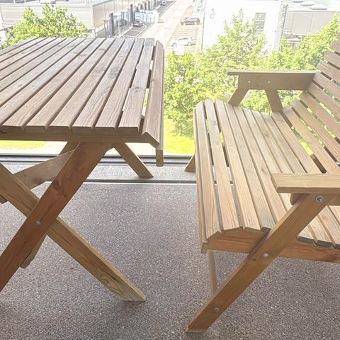 puutarhapöytä ja kaksi penkkiä