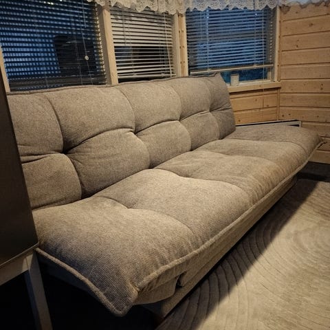 Sohva on siisti, ollut vähäisessä käytössä kakkosasunnossa. Mekanismi ei aina lukkiudu heti, vaan pitää hieman säätää. Tai sitten minä en vaan ymmärrä sen päälle.