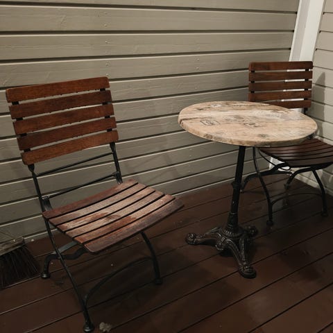 Kaksi kokoon taittuvaa tuolia ja pöytä.