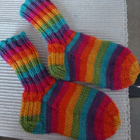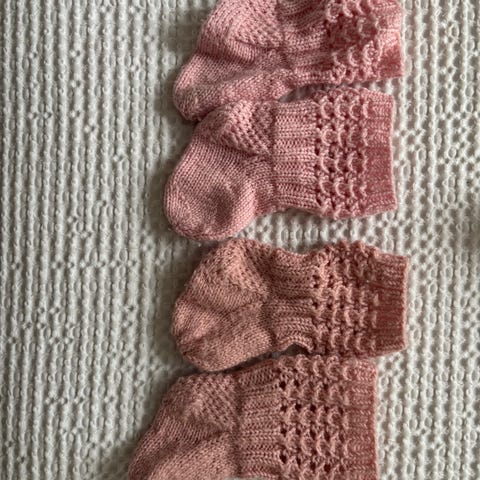 Käsityönä neulottu pienet, nätit villasukat vauvalle.