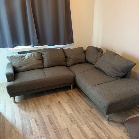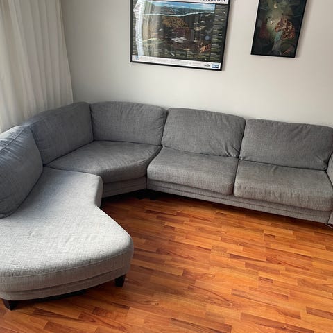 Vaalean harmaa kulmasohva kahdesta moduulista. Runko, jämäkkä, ehjä ja hyväkuntoinen. Päällinen kulunut ja päivitystä kaipaava. Päällinen ei enää istu sohvaan kunnolla, siinä on hyppyjä ja tahroja. (Ei ole liitetty pestä). Ei tietoa merkistä.