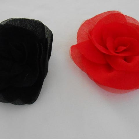 Naisten farkkukankainen rintakoru, jossa kukkamuotoinen kangasosio. Takana on metallinen kiinnitys, jossa sekä rintaneulalukko että klipsi, joten korua voi käyttää sekä rintakoruna että hiuskoristeena. Materiaalina sininen farkkukangas ja metalliosat.