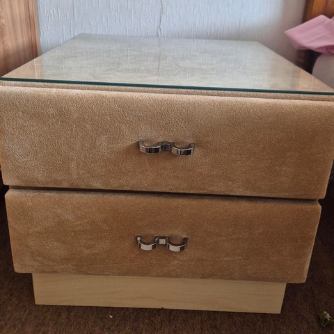 Kaksi kuvan mukaista viininpunaista yöpöytää lasikannella.