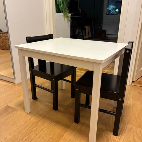 🐣IKEA lastensetti, johon kuuluu puunvärinen lasten pöytä ja kaksi tuolia.