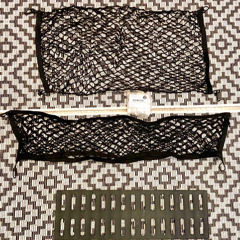 Tavaratilan verkko (3 kpl) ja tilanjakajat / tavaran paikallaan pitävät kaiteet (2 kpl). Kaiteissa tarranauhat pohjassa.