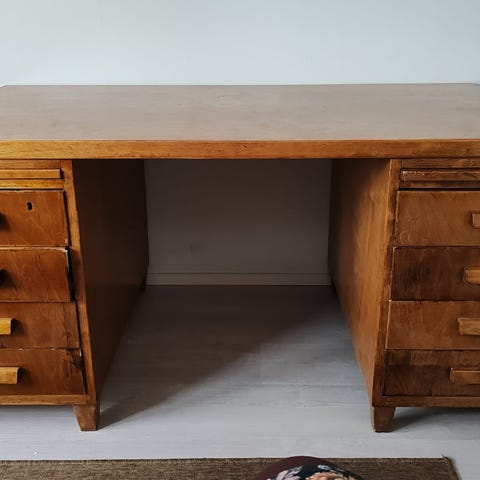Vanha tamminen kirjoituspöytä myynnissä. Laatikot toimii. Ei avaimia. Siistin näköinen. Sivuovien takana kolme vetolaatikkoa. Pöytän saa kolmeen osaan ilman työkaluja, mikä helpottaa kuljetusta. Painava. Hinta 160€. Vain haku.