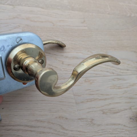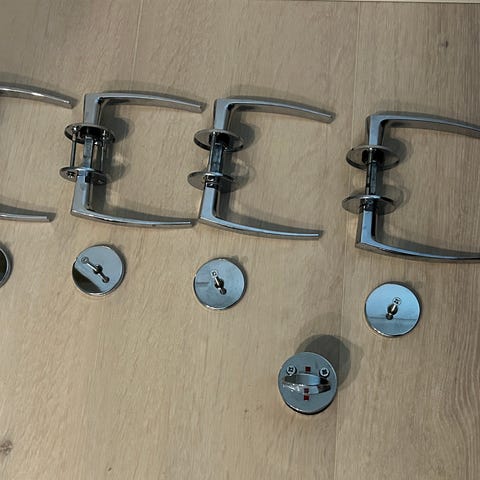 Kromattu ovenpainikesarja, johon sisältyy n. 13 oven kahvoja, lukkorunkoa ym. osia. Sopii sisäoven asennukseen tai vaihtoon.