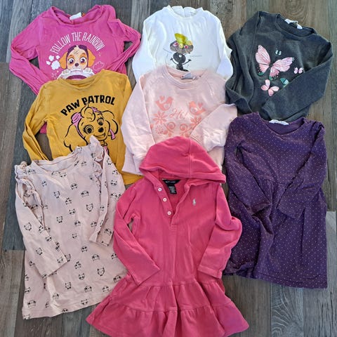 Paljon käytetyt vaatteet, en kuitenkaan bongannut tahroja tai reikiä. Mukavat vaikka päiväkotiin.