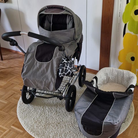Vaunut on meille ostettu uutena 2018 ja kahdella lapsella rakkaudella käytetty, säännöllisesti huollettu ja aina lämpimässä varastossa säilytetty. Sekä runko, vaunukoppa että ratasistuin ovat tosi siistissä kunnossa. Ainoana miinuksena jarrun tangon pään toinen suojatuppi puuttuu.