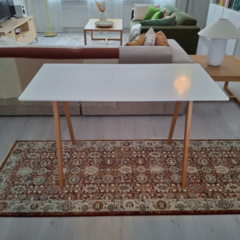 Käytetty mutta hyväkuntoinen työpöytä. Pöydän kansi on puunvärinen, muuten valkoinen.
