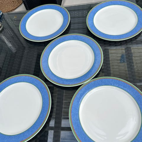 Salaattilautasia ja ruokalautasia 8 kpl kumpaakin, syviä lautasia vain 6 kpl. Uutena nämä on noin 23-26 €/kpl, minä pyydän 17 €/kpl tai koko paketti 340 €.