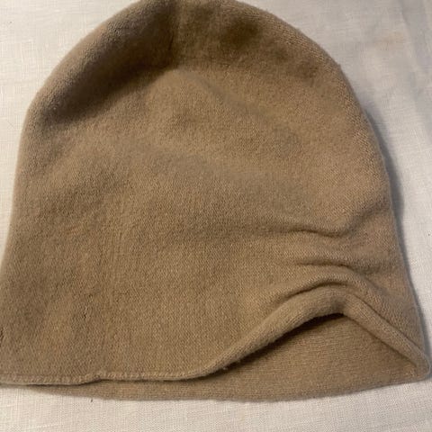 Beige pipo. 50% merinovilla 50% polyakryyli. Sisäpuolella fleecevuori, ei kutia. Mukava päässä.