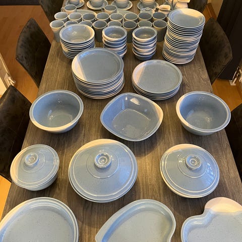 Upea ja vanha KPM astiasto kultareunuksilla ja sinertävillä kukkakoristuksilla.