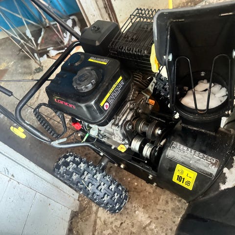 Korjausta vaativa kevyt työnnettävä polttomoottorikäyttöinen lumilinko. Polttoaine alkaa vuotamaan kun polttoainehana avataan (mahdollisesti jumittunut kaasutin?).