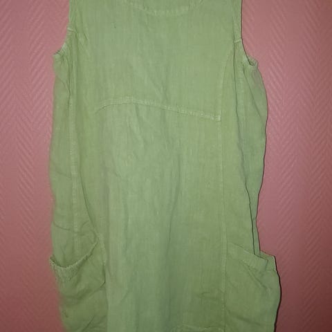 Kauniin oranssi liivimekko. Edessä taskut, sivuilla säätö mahdollisuus, epäsymmetrinen helma. Pellavaa. Koko L, mutta menee mallinsa ansiosta hyvin M kokoiselle myös. Ehjä ja siisti.