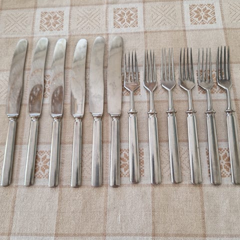 Rachmann & Co aterinsetti metallia. Settiin kuuluu veitsiä ja haarukoita, jotka on pakattu kangasvuorattuun koteloon. Aterimet ovat metallia ja niissä on kaiverrettu valmistajan merkintä terässä. Soveltuu ruokailuun tai kattaukseen useammalle henkilölle. Kotelon sisus on vaaleaa kangasta, joka pitää aterimet paikoillaan säilytyksen ja kuljetuksen aikana.