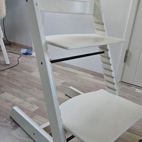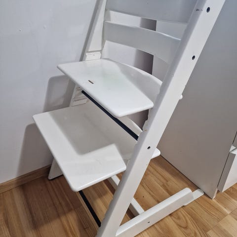 Stokke lasten tuoli, jossa valkoinen istuinosa ja jalkatuki sekä puunväriset jalat. Tuolissa on korkea selkänoja ja sivutuet, jotka antavat lisätukea lapselle. Istuinkorkeutta ja jalkatukea voi säätää ruuvikiinnitysten avulla. Sopii käytettäväksi esimerkiksi ruokapöydän ääressä tai muuna lasten istuimena kotona.