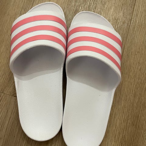 Adidas sandaalit, koko 42-43. Väri musta valkoisilla raidoilla. Avoin malli, jossa leveä jalkapöydän yli menevä remmi. Kenkiä käytetty vain kerran hotellin allasalueella jonka jälkeen todettu ettei sovi leveälestiseen jalkaan.