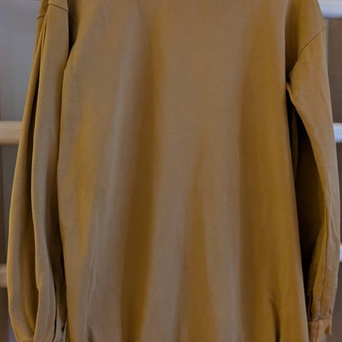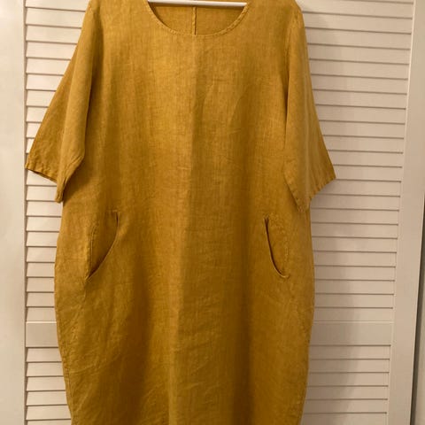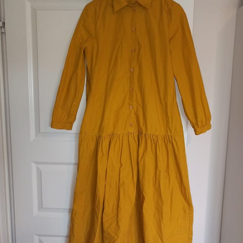 Okrankeltainen samettimekko. Koko L. Leveä frillahelma, nappilista. Kuminauhat hihansuissa. Pari kertaa käytetty.