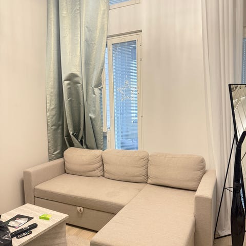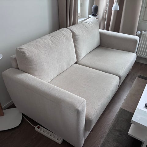 Kissa/koiratalous. Sohvan päällä pidetty peittoa ettei mene karvoihin. Sohva putsataan mahdollisista kissankarvoista ennen hakua.
