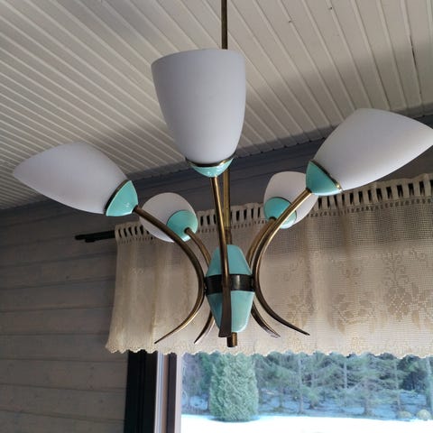 Myydään tummanruskea kattokruunun tyylinen lamppu, kaikki lasipallot löytyy sekä noi lisävitkuttimet mistä en kyllä itse osaa sanoa mihin menee roikkumaan 😂.