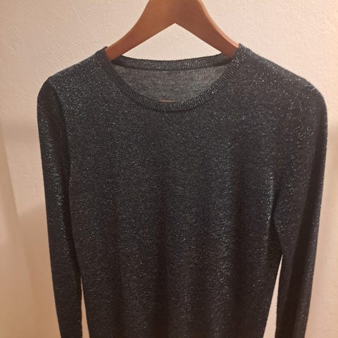 Neuleessa pitkät hihat, malliltaan lyhempi, pituus vyötärölle/navan kohdalle.