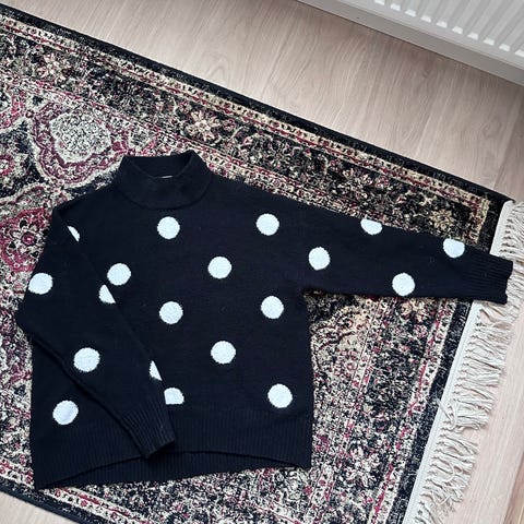 Myydään FB Sister Knitwear-merkkinen neule, musta, jossa valkoisia perhoskuvioita.