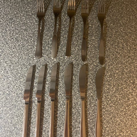 Kuvan ruokailu välineitä. Tarjoa jostain jotain.
