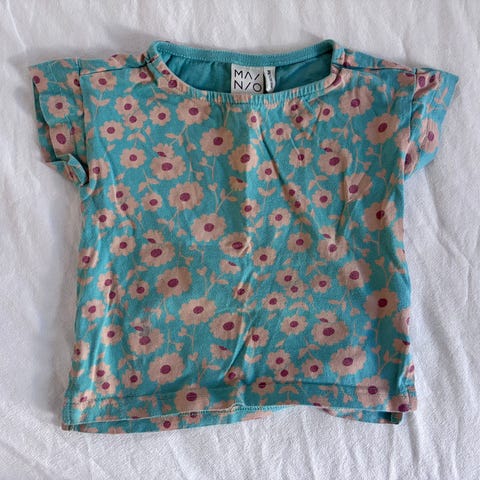 Mainion t-paita, koko 98/104. Siisti ja ehjä, mutta väri haalistunut ja vaalea pohja tummunut.
