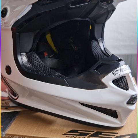 Troy Lee Designs SE4 -kypärä, jossa MIPS-suojaus. Koko M (57–58 cm), väri valkoinen. Kypärässä on useita ilmanotto- ja poistoaukkoja, irrotettava ja pestävä sisusta sekä D-renkaallinen leukahihnan kiinnitys. Soveltuu esimerkiksi motocrossiin tai muuhun offroad-ajoon, jossa käytetään kokokasvokypärää lipalla.