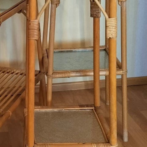 Kukkapöytä (kukkataso) rottinkia ja koivua, kotimaista Annansilmät-käsityötä. Ehjä, ylätaso kuviollista lasia, puuosien lakkapinta osittain kulunut. Myynnissä myös kukkapylväät samaa sarjaa.