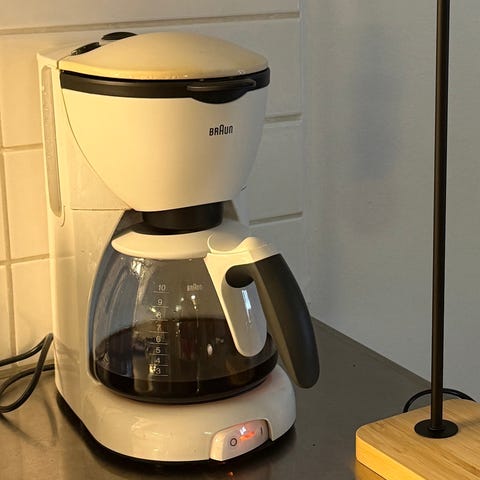 Braun kahvinkeitin valkoisena. Laitteessa on lasikannu, johon mahtuu asteikon mukaan jopa 10 kupillista kahvia. Yläosassa on saranoitu suodatinpidike irrotettavalla suodatinpesällä. Kahvinkeittimessä on virtapainike ja lämmitysalusta kannun alla. Sopii suodatinkahvin valmistukseen kotiin tai toimistoon. Käytetty mutta toimiva.