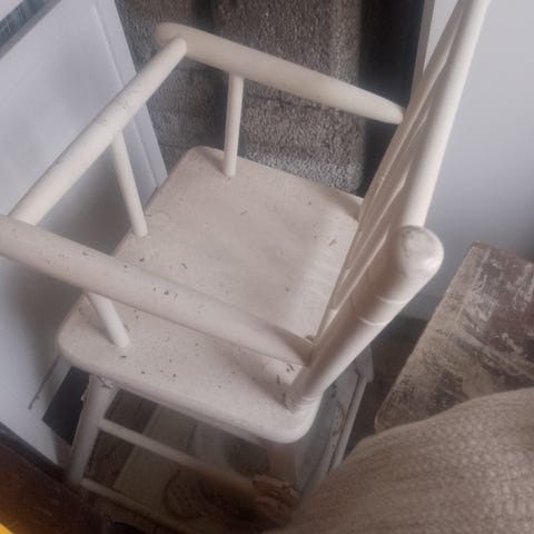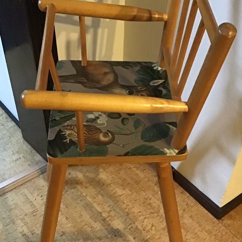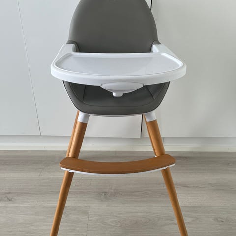 Kinderkraft syöttötuoli. Valkoinen istuinosa ja tarjotin, puujalat ja jalkatuki. Tuolin ulkopinnalla on tarroja, jotka voi halutessaan poistaa.