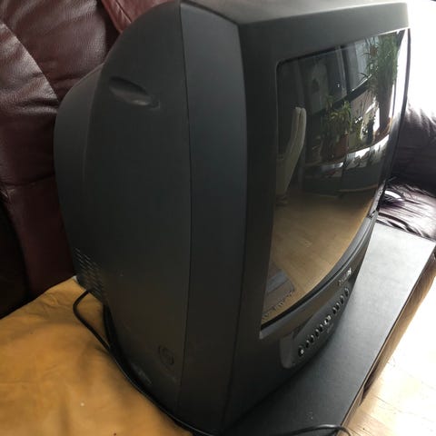 Philips televisio, jossa perinteinen kuvaputkinäyttö ja puuviilupintainen kotelo. Laitteessa on etupuolella kaareva näyttö. Sopii esimerkiksi keräilykäyttöön tai sisustuselementiksi.