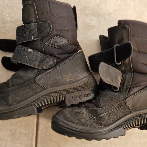 Kuoma talvikengät, koko 35. Nämä olleet yhden talven käytössä ja muutoin päällisin puolin hyväkuntoiset mutta kantapäiden sisävuori kulunut "puhki".