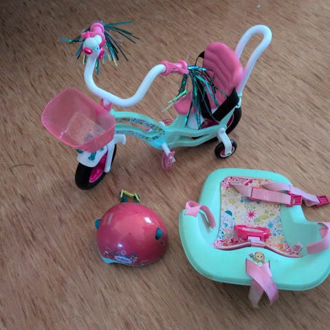 Baby born pyörä. Nalle vilkkuu. Juomapullo perässä, ankka vinkuu, joskin nokkaa hieman irti. Muuten uudenveroinen. Kypärä mukaan.