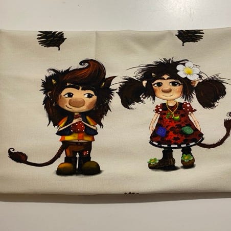 Myyn Ommellisen trikookangaspalan, jossa kolme tyyliteltyä simpanssia. Kankaan pituus 126 cm, leveys 155 cm.