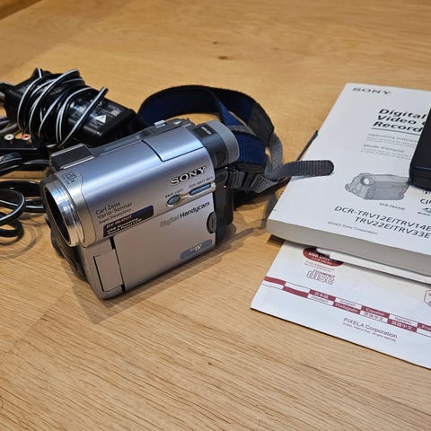 Sony videokamera musta. Käsiotteella varustettu malli, jossa sivulla Sony-logolla varustettu rannelenkki. Kamerassa on objektiivi kiinteällä zoom-rengasrakenteella ja takana etsin. Sopii videoiden tallentamiseen esimerkiksi arjesta, tapahtumista ja matkoilta. Laturi ei tule mukana.