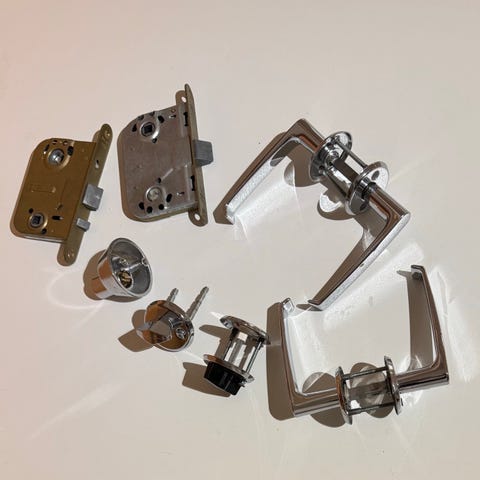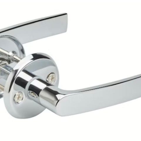 Metallinen ovenpainikesarja, krominvärinen pinta. Sarjaan kuuluu kaksi painiketta, kiinnitysosat kuvan mukaisesti. Soveltuu sisäoven kahvaksi, mitoitus tavanomaiselle väliovelle. Sisältää yhden välitapin, toinen puuttuu. Mukaan lisäksi wc-lukko.
