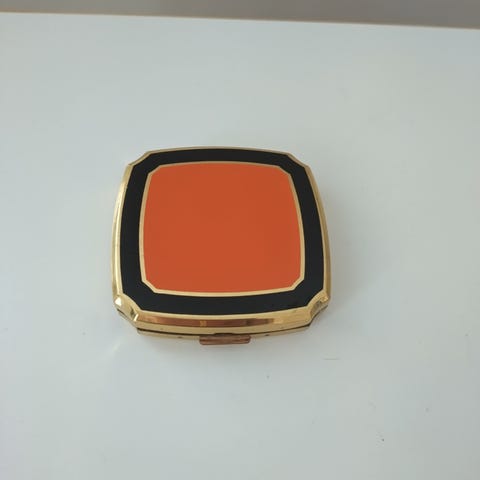1940 luvulta? Made in Great Britain lukee sisällä. Käyttämätön puuterivippa, ehjä peili. Hyvin kestänyt aikaa, ajan jälkiä on. Kullanvärinen metallinen rasia, kankainen, kirjailtu kansi liimattu.