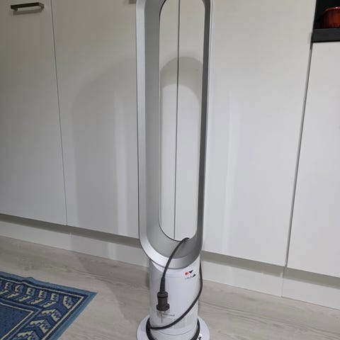 Viime kesänä 2025 ostettu Dyson AM07 lattiatuuletin. Alkuperäisessä pakkauksessaan pehmusteissa. Ohjekirja tallella ja tuulettimessa vielä tarratkin paikallaan.