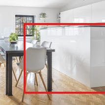 Keittiösaareke, jossa valkoinen suorakulmainen kivinen työtaso ja musta runko. Saarekkeessa on useita vetolaatikoita sekä avohyllyjä säilytystä varten. Soveltuu keittiön työskentelytasoksi ja ruokailupaikaksi, ympärille mahtuu useita baarijakkaroita. Saareke sijoittuu vapaasti lattialle ja toimii myös tilanjakajana oleskelu- ja keittiötilan välillä.