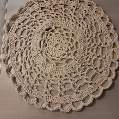 Puuvillatrikoosta käsityönä itse virkattu UUSI pyöreä pitsimatto iso 130cm.