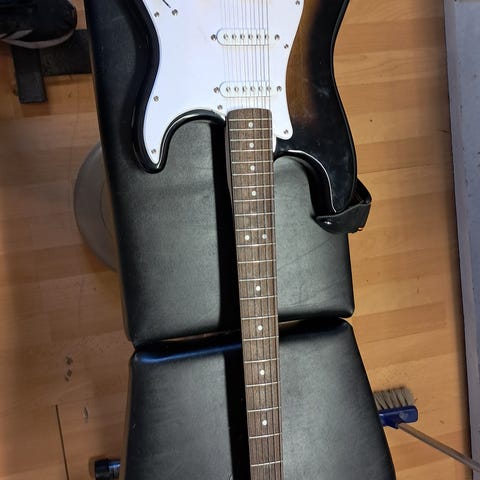 Sähkökitara ja Peavey-kitaravahvistin. Sähkökitarassa on kolmivärinen sunburst-viimeistely ja valkoinen pleksi sekä useita yksikelaisia mikrofoneja. Vahvistimessa on etupaneelissa useita säätimiä äänenvoimakkuudelle ja soundin muokkaukselle sekä kaiutinritilä edessä. Kokonaisuus soveltuu sähkökitaran soittoon kotona tai harjoituskäytössä, ja mukana on kitarapiuha vahvistimeen liittämistä varten.