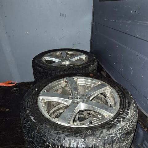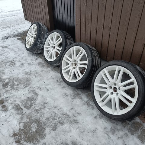Otettu VW passatin alta. Auto lähti, vanteet jäi. Renkaat paskat, kankaat näkyy. Parissa on pinnassa naarmuja jotka tullu kapeesta trailerista, muuten hyvät.