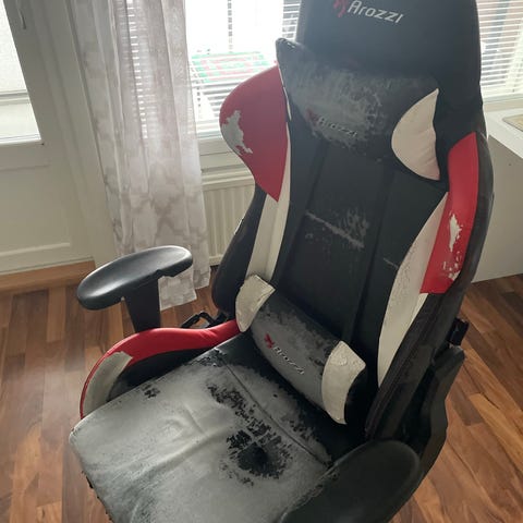 Kuvan toimistotuoli. Toimii muuten mutta käsinojissa kulumia jotka kuvissa. Tarpeeton meillä. Pyöriä en ole vielä löytänyt, vaikka tähän sellaisetkin saa.