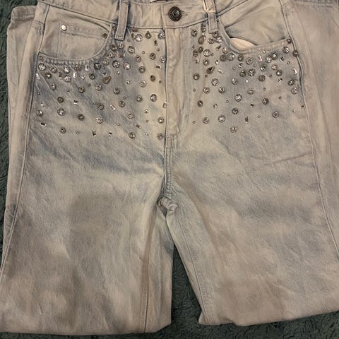 Trendy high-waist straight Guess jeans in light blue wash with distressed knee details and raw hem. Very comfortable and flattering fit. Selling because they no longer fit after gym progress. Good used condition.