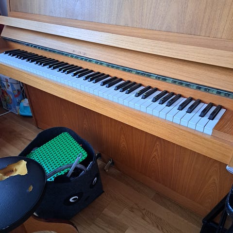 Fazerin piano 1990-luvulta. Virityksen tarpeessa, yksi pedaali ei toimi kunnolla ja pari kosketinta myös ”mykkiä”. Hae pois ja korjaa!
